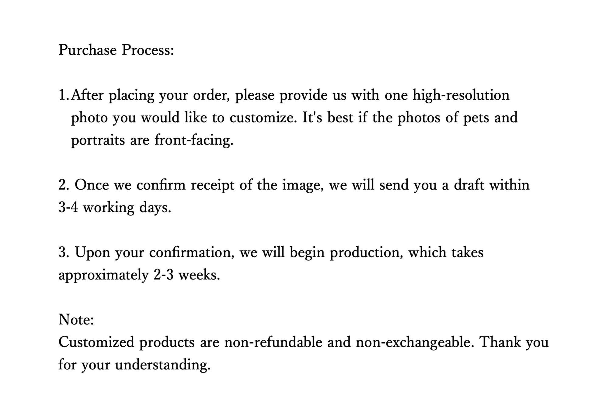 - Please confirm the draft within 1-2 days. If we don't receive confirmation within 3 days, production will begin automatically. Production time is 1-3 weeks.